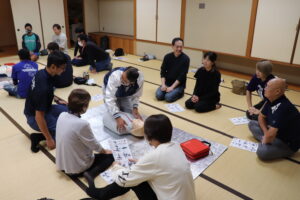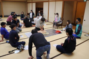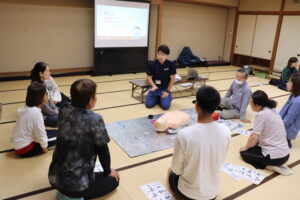 令和7年10月5日(日) 西春日井広域事務組合 消防本部 東消防署の方を講師に迎え、総合体育館和風会議室において、今年度もスポーツ指導者講習会(普通救命講習Ⅰ)が行われました。スポーツ協会加盟団体より合計30名が、救命救急の方法等をビデオで学習しながら実践し、受講しました。